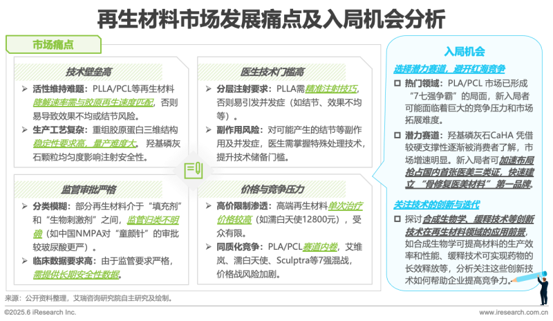 再生材料市場(chǎng)正面臨著技術(shù)壁壘高、醫(yī)生技術(shù)門檻高、監(jiān)管審批嚴(yán)格以及價(jià)格與競(jìng)爭(zhēng)壓力大的多重挑戰(zhàn)。然而,市場(chǎng)痛點(diǎn)背后也蘊(yùn)藏著入局機(jī)會(huì)。新入局者可選擇潛力賽道,避開(kāi)紅海競(jìng)爭(zhēng),如羥基磷灰石CaHA憑借其較硬支撐性逐漸被消費(fèi)者了解,市場(chǎng)增長(zhǎng)迅速,新入局者可加速布局,搶占國(guó)內(nèi)尚未有三類證的先機(jī),快速建立品牌優(yōu)勢(shì)。同時(shí),要關(guān)注技術(shù)的創(chuàng)新與迭代,比如合成生物學(xué)可提高材料的生產(chǎn)效率和性能,緩釋技術(shù)可實(shí)現(xiàn)藥物的長(zhǎng)效釋放等,深入分析這些創(chuàng)新技術(shù)在再生材料領(lǐng)域的應(yīng)用前景,助力企業(yè)提高競(jìng)爭(zhēng)力,從而在再生材料市場(chǎng)中尋得發(fā)展新路徑。