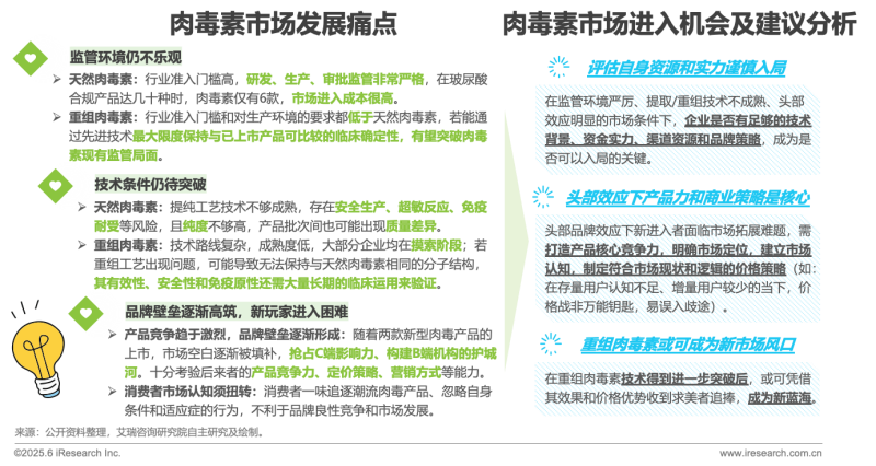 雖然肉毒素市場(chǎng)開(kāi)始走向白熱化競(jìng)爭(zhēng),且我國(guó)肉毒素滲透率遠(yuǎn)低于全球、仍有很大發(fā)展空間;但考慮到當(dāng)前的醫(yī)美人群整體增量少,老牌肉毒品牌力強(qiáng)導(dǎo)致市場(chǎng)空間有限,監(jiān)管環(huán)境不容樂(lè)觀,技術(shù)條件不夠成熟等市場(chǎng)條件;不管是企業(yè)還是資本,投資肉毒素的“投入產(chǎn)出比”都是最核心的問(wèn)題。因此,企業(yè)需評(píng)估自身資源和實(shí)力謹(jǐn)慎入局;在頭部效應(yīng)的壁壘下,產(chǎn)品力強(qiáng)、渠道資源力強(qiáng)、市場(chǎng)定位明確、價(jià)格策略合適的產(chǎn)品才能獲得脫穎而出的機(jī)會(huì)。未來(lái),隨著新產(chǎn)品的相繼涌出、低成本的重組技術(shù)的發(fā)展,市場(chǎng)競(jìng)爭(zhēng)將愈演愈烈,肉毒素企業(yè)可能需要做好打“價(jià)格戰(zhàn)”的準(zhǔn)備,或去海外尋找一些新的合作機(jī)會(huì)。
