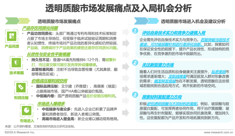 中國(guó)透明質(zhì)酸行業(yè)近年來(lái)經(jīng)歷了顯著的增長(zhǎng),這一趨勢(shì)得益于市場(chǎng)需求的不斷擴(kuò)大以及應(yīng)用領(lǐng)域的持續(xù)拓展。然而,在這一高速增長(zhǎng)的背后,行業(yè)也面臨著產(chǎn)品同質(zhì)化、長(zhǎng)效性與安全性平衡難題、價(jià)格戰(zhàn)和市場(chǎng)進(jìn)入障礙等痛點(diǎn)。盡管如此,行業(yè)的發(fā)展并非沒(méi)有機(jī)遇。技術(shù)創(chuàng)新是實(shí)現(xiàn)產(chǎn)品差異化的關(guān)鍵,企業(yè)可以通過(guò)研發(fā)新技術(shù)、改進(jìn)生產(chǎn)工藝等方式,提升產(chǎn)品的競(jìng)爭(zhēng)力。企業(yè)若能評(píng)估自身技術(shù)實(shí)力實(shí)現(xiàn)差異化創(chuàng)新,關(guān)注私密美容等新型潛力市場(chǎng),探索與膠原蛋白等材料復(fù)配的潛力方向,也能在競(jìng)爭(zhēng)中尋得入局發(fā)展的機(jī)會(huì)。