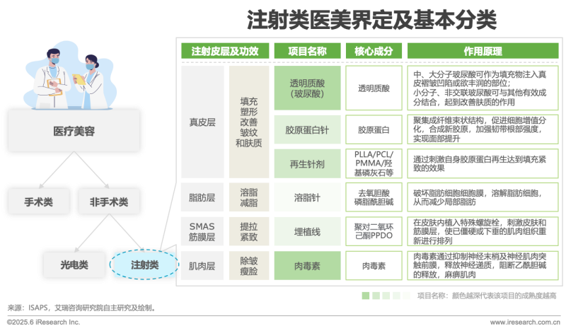 近年來(lái),中國(guó)醫(yī)美市場(chǎng)呈現(xiàn)爆發(fā)式增長(zhǎng)態(tài)勢(shì),其中以聲光電類和注射類項(xiàng)目最受消費(fèi)者青睞,已成為醫(yī)美消費(fèi)的“雙引擎”。從市場(chǎng)表現(xiàn)來(lái)看,聲光電類項(xiàng)目市場(chǎng)份額略高于注射類項(xiàng)目,這類項(xiàng)目主要以緊致抗衰為主,多為無(wú)創(chuàng)/微創(chuàng)項(xiàng)目,以更“輕”的手段達(dá)到抗衰的目的吸引了更多消費(fèi)者。但事實(shí)上,注射類項(xiàng)目同樣占據(jù)著舉足輕重的市場(chǎng)地位,為幫助行業(yè)從業(yè)者更深入了解注射類醫(yī)美市場(chǎng),本期文章我們部分轉(zhuǎn)載了艾瑞咨詢的《中國(guó)注射類醫(yī)美行業(yè)研究報(bào)告》,以供相關(guān)企業(yè)參考。