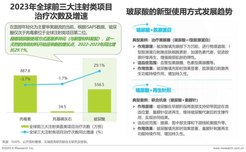 隨著醫(yī)美上游材料的多樣化,玻尿酸作為“頂流”的地位是否會(huì)受到?jīng)_擊一直是行業(yè)內(nèi)熱議的話題。根據(jù)ISAPS數(shù)據(jù),2023年全球注射類項(xiàng)目排名中,玻尿酸僅次于肉毒素位居第二。但隨著玻尿酸的復(fù)配方式多樣化、聯(lián)合治療手段越來(lái)越成熟,其應(yīng)用邊界被不斷拓寬,2022-2023年增速遠(yuǎn)超肉毒素達(dá)29.1%,似乎迎來(lái)了它的“第二增長(zhǎng)曲線”。