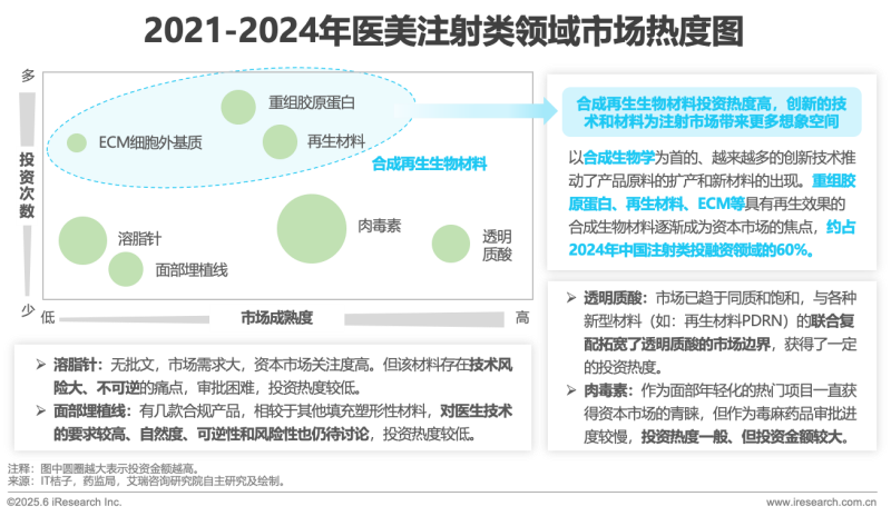 技術(shù)的進(jìn)步推動(dòng)著上游原料的擴(kuò)產(chǎn)和材料的多樣化、安全化和同源化,ECM等各種新型材料不斷出現(xiàn),以重組膠原蛋白、再生材料等為首的合成再生生物材料成為醫(yī)美機(jī)構(gòu)投資重點(diǎn)。根據(jù)IT桔子數(shù)據(jù),2024年包括泰美瑞、圣至潤(rùn)和等在內(nèi)的再生生物材料領(lǐng)域的企業(yè)紛紛融資,投資事件約占總注射類材料投資的60%。按照審批情況來(lái)看,根據(jù)藥監(jiān)局不完全統(tǒng)計(jì),截止到2024年11月一共有15款針劑通過(guò)審批,以玻尿酸類為主,還有幾款聚左旋乳酸、聚己內(nèi)酯和肉毒素類產(chǎn)品。雖然玻尿酸領(lǐng)域近年來(lái)投資熱度一般,但其仍為注射類市場(chǎng)的“老字號(hào)產(chǎn)品”和“熱門賽道”,與各種新型材料的聯(lián)合復(fù)配也將進(jìn)一步豐富產(chǎn)品矩陣,拓寬注射類市場(chǎng)邊界。