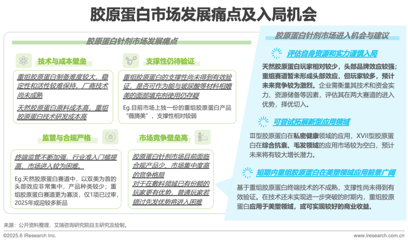 膠原蛋白作為人體內(nèi)天然存在的成分,與玻尿酸一樣,對(duì)醫(yī)療美容存在著重大的意義。目前,膠原蛋白二類械市場(chǎng)競(jìng)爭(zhēng)已十分火熱,但鑒于終端技術(shù)的限制,醫(yī)美針劑等三類械市場(chǎng)仍相對(duì)空白。隨著2025年三類械批證的增加,膠原蛋白針劑市場(chǎng)競(jìng)爭(zhēng)將逐漸激烈,市場(chǎng)格局有望產(chǎn)生新的變化。由于終端技術(shù)還不夠成熟,成本困境仍未突破,相較于玻尿酸等市場(chǎng),膠原蛋白針劑在醫(yī)美領(lǐng)域的滲透率相對(duì)較低;但鑒于其天然性、與人體的適配性,在技術(shù)突破之前,或?qū)⒃诿浪茴I(lǐng)域侵占較大市場(chǎng)份額。