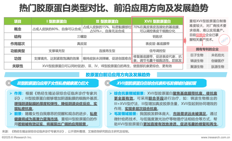 膠原蛋白按照結(jié)構(gòu)和功能可以劃分為28種類型(包括I、Ⅱ、Ⅲ、Ⅳ、Ⅴ、Ⅵ、Ⅹ、XVII…),每種類型的膠原蛋白在人體中扮演著不同的角色。近年來(lái),醫(yī)美行業(yè)應(yīng)用最為廣泛的是I型和Ⅲ型膠原蛋白,起到面部支撐填充及皮膚水潤(rùn)彈嫩的效果,是抗衰界的潮流產(chǎn)品。隨著對(duì)這兩種膠原蛋白適應(yīng)癥的不斷開(kāi)拓、專業(yè)玩家技術(shù)的成熟及下游消費(fèi)者需求的進(jìn)階,以XVII型為代表的更多類型的膠原蛋白及其多元功效被不斷發(fā)掘,終端應(yīng)用場(chǎng)景不斷拓展,產(chǎn)品矩陣日漸豐富。