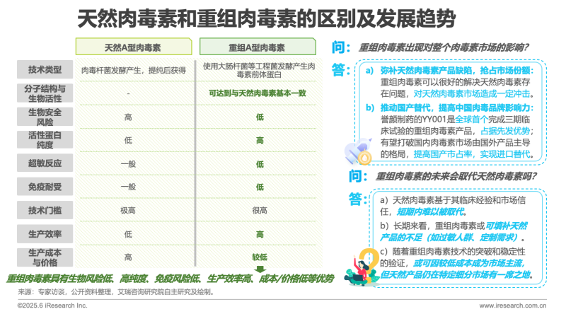 天然肉毒素是從肉毒桿菌培養(yǎng)液中提取的神經(jīng)毒素,含有毒素蛋白及輔助蛋白,臨床應(yīng)用歷史悠久,但可能存在批次差異和雜質(zhì)風(fēng)險(xiǎn)。重組肉毒素通過(guò)基因工程生產(chǎn),僅含純化毒素蛋白,純度高、穩(wěn)定性強(qiáng),并可定制化調(diào)整效力或持久性。未來(lái),重組肉毒素有望憑借安全性和可設(shè)計(jì)性逐步滲透醫(yī)美市場(chǎng),但短期內(nèi)天然產(chǎn)品仍占主導(dǎo)。長(zhǎng)期來(lái)看,兩者可能共存——重組產(chǎn)品側(cè)重高純度、個(gè)性化需求,而天然產(chǎn)品依賴品牌信任和成熟應(yīng)用。技術(shù)進(jìn)步和成本優(yōu)化將是重組肉毒素能否顛覆市場(chǎng)的關(guān)鍵。