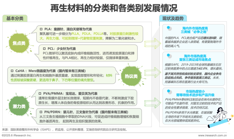 醫(yī)美再生注射類產(chǎn)品通常以微球的形式存在,通過(guò)刺激人體自身膠原蛋白的再生,起到填充凹陷、緊致肌膚、美容塑型的作用。醫(yī)美再生材料種類較多,近兩年市場(chǎng)焦點(diǎn)基本集中在聚乳酸(PLA)和聚己內(nèi)酯(PCL)兩大類別,以童顏針、少女針為代表的一系列再生針劑賦予醫(yī)美市場(chǎng)更豐富的品類和更高的增速,也成為各大廠商進(jìn)軍再生領(lǐng)域的“必爭(zhēng)之地”。其次,羥基磷灰石(CaHA)作為人體中天然存在的一種材料廣泛用于骨修復(fù),它較硬的支撐性或可推動(dòng)其未來(lái)在隆鼻、墊下巴等填充領(lǐng)域獲得較大市場(chǎng)份額。