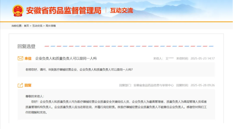根據(jù)安徽省藥監(jiān)局的答復(fù),企業(yè)負(fù)責(zé)人和質(zhì)量負(fù)責(zé)人均為醫(yī)療器械經(jīng)營(yíng)企業(yè)質(zhì)量安全關(guān)鍵崗位人員,企業(yè)負(fù)責(zé)人為最高管理者,質(zhì)量負(fù)責(zé)人為高層管理人員或者質(zhì)量管理機(jī)構(gòu)負(fù)責(zé)人。企業(yè)質(zhì)量負(fù)責(zé)人應(yīng)當(dāng)在職在崗,并履行崗位職責(zé)。故醫(yī)療器械經(jīng)營(yíng)企業(yè)質(zhì)量負(fù)責(zé)人不能兼任企業(yè)負(fù)責(zé)人。