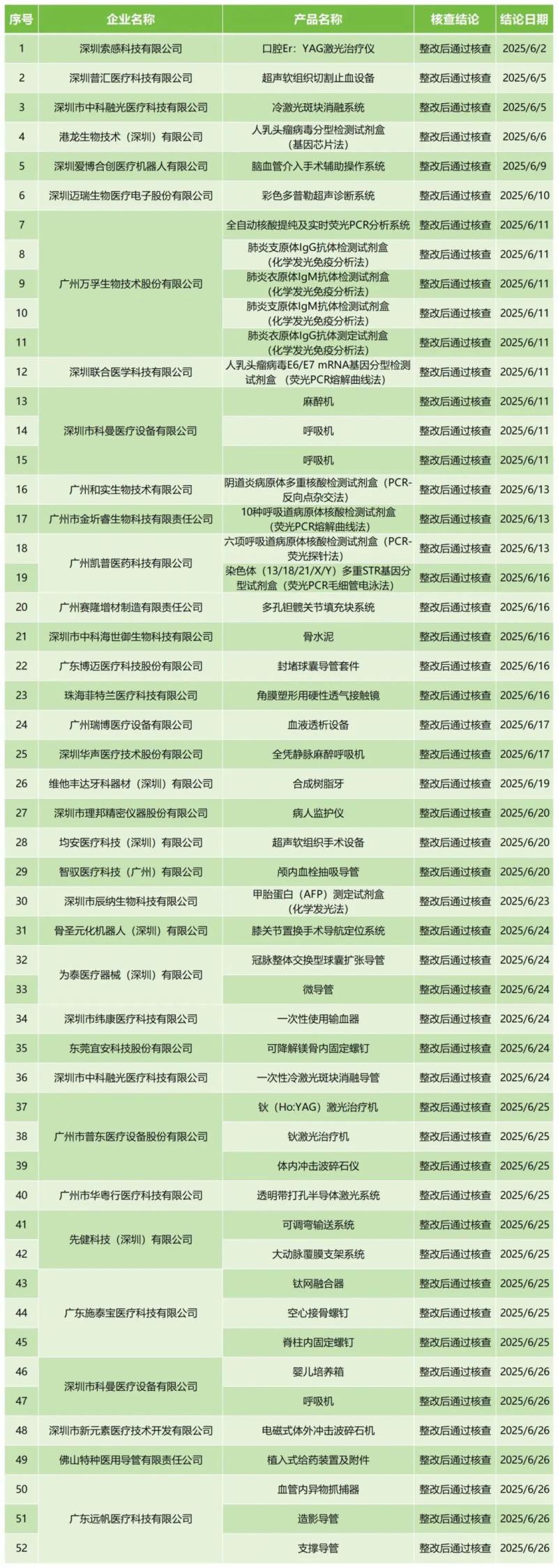 7月16日,廣東省藥監(jiān)局官網(wǎng)公布2025年6月醫(yī)療器械注冊質(zhì)量管理體系核查結(jié)果,包括深圳索感科技有限公司的口腔Er:YAG激光治療儀、廣州萬孚生物技術(shù)股份有限公司的全自動(dòng)核酸提純及實(shí)時(shí)熒光PCR分析系統(tǒng)、廣州市普東醫(yī)療設(shè)備股份有限公司的鈥(Ho:YAG)激光治療機(jī)、深圳市科曼醫(yī)療設(shè)備有限公司的呼吸機(jī)等共計(jì)52款產(chǎn)品,均為“整改后通過核查”。具體明細(xì)見下方表格: