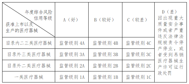 第六條 根據(jù)本市醫(yī)療器械生產(chǎn)企業(yè)年度綜合風(fēng)險(xiǎn)信用評(píng)定情況(評(píng)定指標(biāo)詳見(jiàn)附件,市藥品監(jiān)管局可結(jié)合監(jiān)管實(shí)際適時(shí)調(diào)整評(píng)定指標(biāo)),將企業(yè)劃分為A、B、C、D四個(gè)等級(jí)。