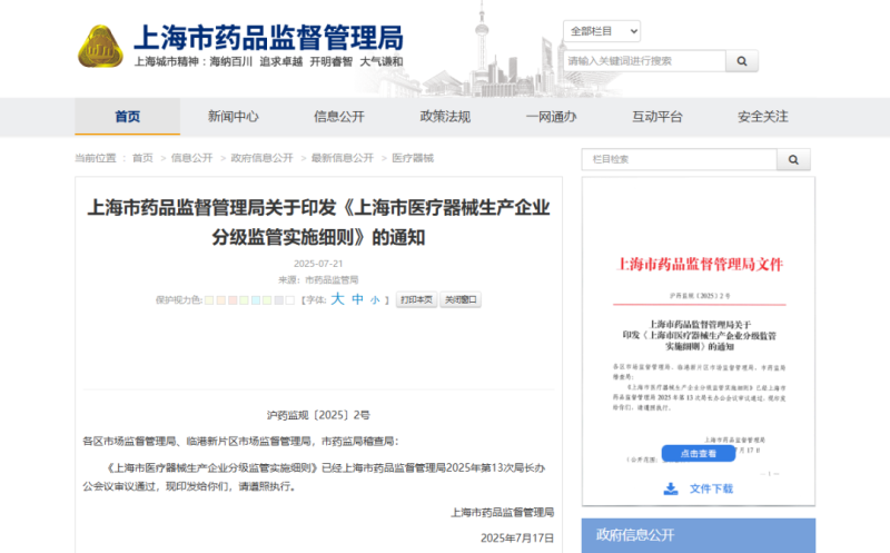 7月21日,上海市藥監(jiān)局發(fā)布《上海市醫(yī)療器械生產(chǎn)企業(yè)分級(jí)監(jiān)管實(shí)施細(xì)則》(以下簡(jiǎn)稱(chēng)《實(shí)施細(xì)則》),《實(shí)施細(xì)則》適用于對(duì)上海市醫(yī)療器械生產(chǎn)企業(yè)開(kāi)展的日常監(jiān)督管理活動(dòng),所稱(chēng)生產(chǎn)企業(yè)包括醫(yī)療器械注冊(cè)人、備案人以及受托生產(chǎn)企業(yè)。