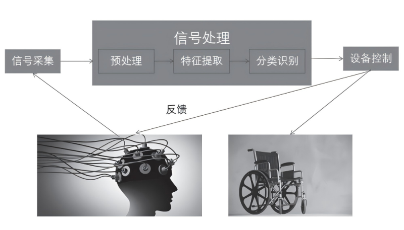 20世紀70年代初,美國加州大學洛杉磯分校的計算機科學教授雅克·維達爾(Jacques Vidal)首次提出了“腦機接口”這一名詞 。經過數十年的發(fā)展,腦機接口已逐漸成為電腦通信技術的新種類之一。其基本原理是,人們使用腦機接口收集腦電信號,利用腦電信號控制電腦程序。目前,腦機接口技術已經取得了諸多突破并且在多個領域得到應用和推廣,尤其是在康復醫(yī)學領域。有研究表明,腦機接口可通過患者的運動想象來刺激大腦皮層相關區(qū)域,然后利用收集到的腦電信號來啟動功能性電刺激,并以此來刺激受損的肌肉神經,患者可以利用此電刺激主動參與發(fā)力,以達到改善運動功能的效果。腦機接口的工作原理可以分為信號采集、信號處理、控制設備和反饋 4 個部分,具體如下。