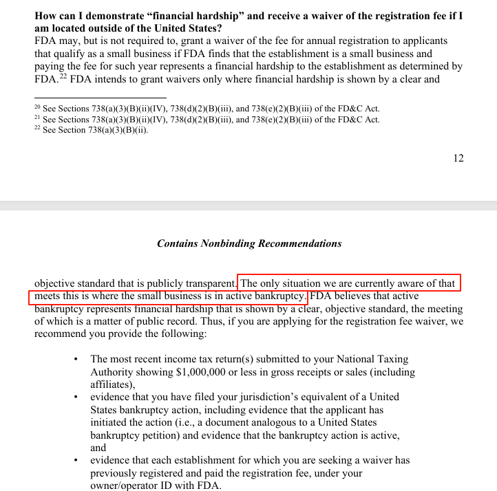FDA 僅會在申請人通過公開透明的明確客觀標(biāo)準(zhǔn)證明其經(jīng)濟(jì)困難時授予豁免。目前FDA確認(rèn)符合該標(biāo)準(zhǔn)的 唯一情形 為:企業(yè)處于 active bankruptcy(在審破產(chǎn)程序)狀態(tài)(FDA認(rèn)為在審破產(chǎn)程序符合“明確客觀標(biāo)準(zhǔn)”,且該狀態(tài)屬于公開法律記錄)。
