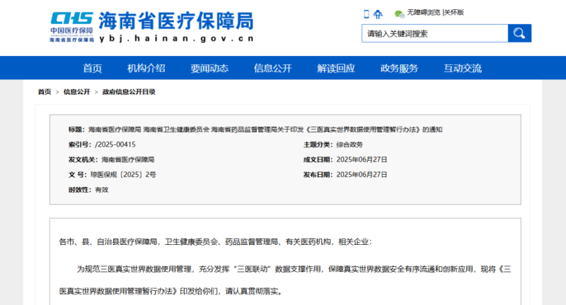 近日,海南省醫(yī)療保障局、海南省衛(wèi)生健康委員會(huì)、海南省藥品監(jiān)督管理局聯(lián)合印發(fā)《三醫(yī)真實(shí)世界數(shù)據(jù)使用管理暫行辦法》(以下簡(jiǎn)稱《辦法》),自2025年8月1日起正式施行,有效期5年。作為國(guó)內(nèi)首個(gè)明確整合醫(yī)療、醫(yī)保、醫(yī)藥(以下簡(jiǎn)稱“三醫(yī)”)三方真實(shí)世界數(shù)據(jù)資源并規(guī)范其應(yīng)用的管理文件,《辦法》的出臺(tái)標(biāo)志著海南在利用真實(shí)世界證據(jù)支持藥械研發(fā)與評(píng)審、優(yōu)化醫(yī)保決策方面邁出關(guān)鍵一步。