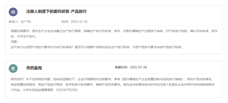 國(guó)家藥監(jiān)局發(fā)布的《關(guān)于進(jìn)一步加強(qiáng)醫(yī)療器械注冊(cè)人委托生產(chǎn)監(jiān)督管理的公告(2024年第38號(hào))》提到:“受托生產(chǎn)企業(yè)應(yīng)當(dāng)建立生產(chǎn)放行規(guī)程,明確生產(chǎn)放行的標(biāo)準(zhǔn)、條件,對(duì)醫(yī)療器械生產(chǎn)過(guò)程進(jìn)行審核,對(duì)產(chǎn)品進(jìn)行檢驗(yàn),確認(rèn)符合標(biāo)準(zhǔn)、條件的,方可生產(chǎn)放行。”