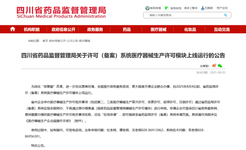 8月4日,四川省藥監(jiān)局發(fā)布《關(guān)于許可(備案)系統(tǒng)醫(yī)療器械生產(chǎn)許可模塊上線運(yùn)行的公告》(以下簡(jiǎn)稱《公告》),其中提到,自2025年8月4日起,省藥監(jiān)局許可(備案)系統(tǒng)醫(yī)療器械生產(chǎn)許可模塊上線運(yùn)行。