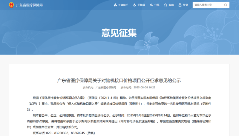近日,廣東省醫(yī)療保障局公布“侵入式腦機(jī)接口置入費(fèi)”等腦機(jī)接口價格項目,同時制定可收費(fèi)的一次性使用醫(yī)用耗材清單,并將價格項目進(jìn)行公示。公示時間:2025年8月8日至2025年8月14日。