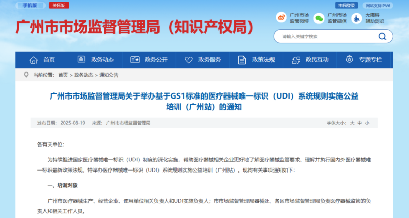 8月19日,廣州市市場監(jiān)督管理局發(fā)布《關于舉辦基于GS1標準的醫(yī)療器械唯一標識(UDI)系統(tǒng)規(guī)則實施公益培訓(廣州站)的通知》,該培訓由廣州市市場監(jiān)督管理局、中國物品編碼中心主辦,廣州市標準化研究院(中國物品編碼中心廣州分中心)承辦,誠邀廣州市醫(yī)療器械生產、經營企業(yè)、使用單位相關負責人和UDI實施負責人報名參加。培訓內容及報名方式如下: