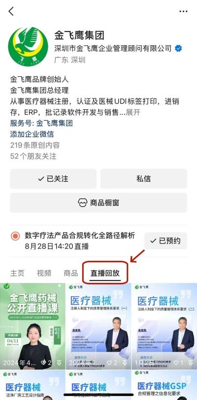 往期直播培訓課程支持回放,關注“金飛鷹藥械咨詢服務”視頻號并點擊視頻號主頁,即可查看“直播回放”哦~