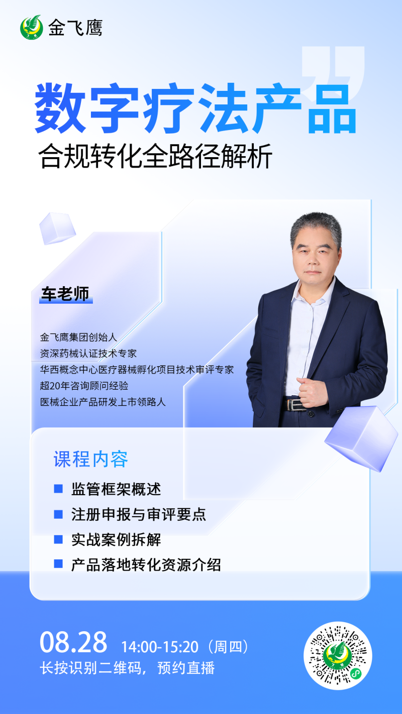這些關鍵問題正制約著行業(yè)的快速發(fā)展。在此背景下,由金飛鷹、成都市溫江區(qū)永寧街道商會、四川省供貨商商會主辦,成都市技術轉移聯(lián)盟、四川大學商學院MEM中心、四川西部醫(yī)藥技術轉移中心、成都高新區(qū)醫(yī)療器械創(chuàng)新轉化協(xié)會、成都天府新區(qū)地平線探索數(shù)據(jù)咨詢服務中心、成都長健偉業(yè)生物科技有限公司、成都高新區(qū)數(shù)智醫(yī)療創(chuàng)新聯(lián)盟會、成都連康投資有限公司協(xié)辦的“智造未來·醫(yī)鏈共生”——溫江三醫(yī)創(chuàng)新中心醫(yī)療器械產(chǎn)業(yè)生態(tài)合作交流會,將于8月28日下午在溫江區(qū)科大科創(chuàng)谷三醫(yī)創(chuàng)新中心路演廳舉辦。本次峰會由金飛鷹集團創(chuàng)始人車號爽老師主導進行分享,他將結合金飛鷹輔導過的眾多成功案例,深入剖析數(shù)字療法產(chǎn)品合規(guī)轉化全路徑,為企業(yè)提供產(chǎn)品落地轉化的全方位指導,助力企業(yè)在數(shù)字療法賽道上實現(xiàn)突破性發(fā)展!