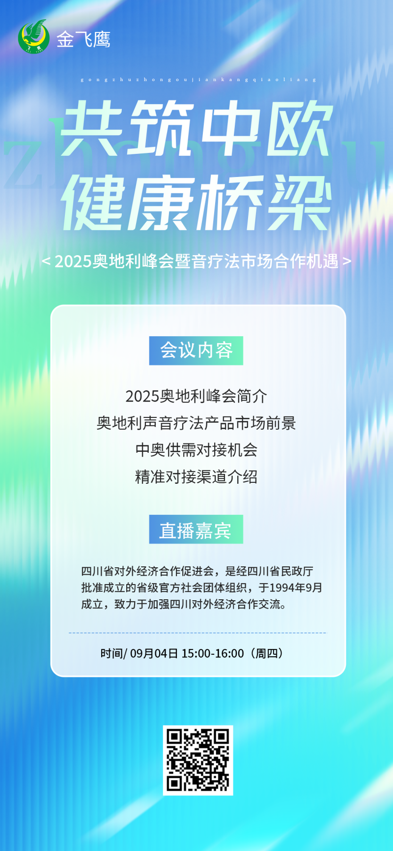 在此背景下,9月4日下午3點,我們特別聯(lián)合四川省對外經(jīng)濟合作促進會,給大家?guī)?/span>第十一屆“全球經(jīng)濟發(fā)展論壇·奧地利峰會”暨音療法市場合作機遇的直播,為您解鎖奧地利市場的財富密碼!本期直播將從奧地利音療法產(chǎn)品市場前景、中奧供需對接機會及渠道等方面進行分享,與各位共拓奧地利的掘金版圖,感興趣的朋友記得提前預(yù)約!