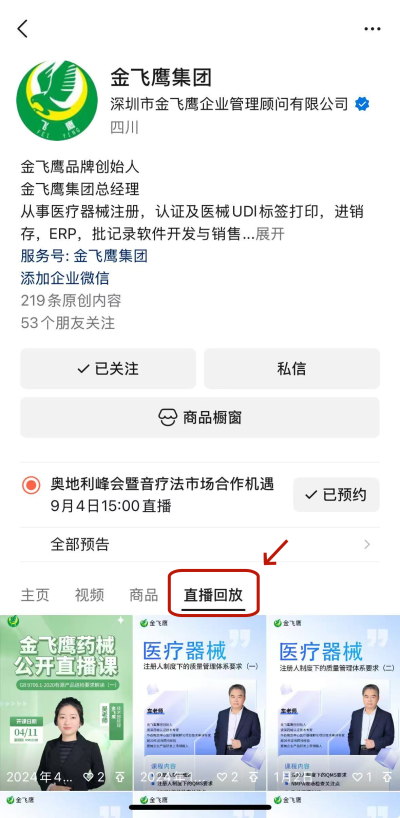 往期直播培訓(xùn)課程支持回放,關(guān)注“金飛鷹藥械咨詢服務(wù)”視頻號并點(diǎn)擊視頻號主頁,即可查看“直播回放”哦~