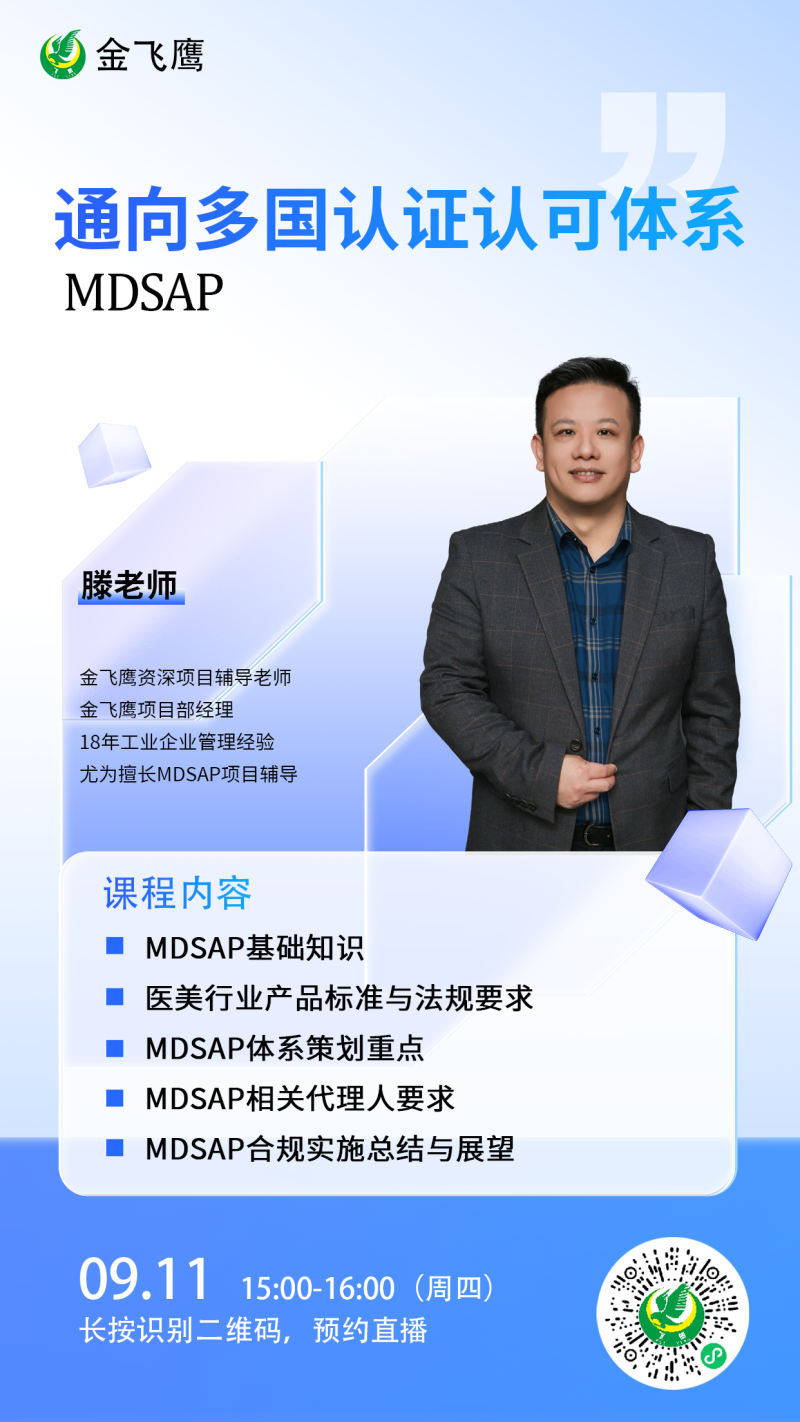 9月11日下午3點(diǎn),金飛鷹高級項目咨詢師、有著諸多MDSAP項目輔導(dǎo)經(jīng)驗的滕老師,給大家深入淺出地講解MDSAP審核的核心邏輯與應(yīng)對技巧,讓您不僅“知其然”,更“知其所以然”!感興趣的朋友記得提前預(yù)約,鎖定這場合規(guī)必修課!